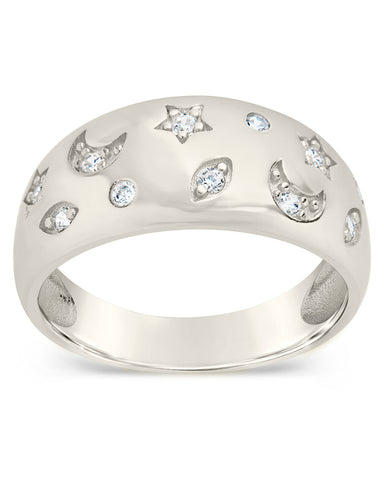 Add celestial shine to your look! This gorgeous dome band ring is adorned with CZ-studded stars, planets, and moons. Available in gold and silver tones.
